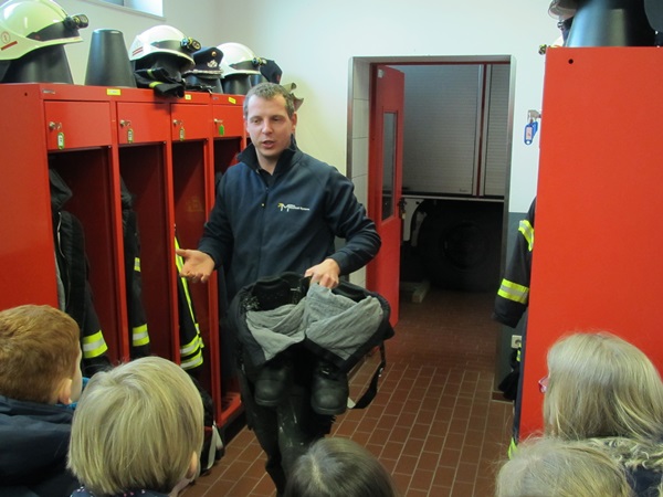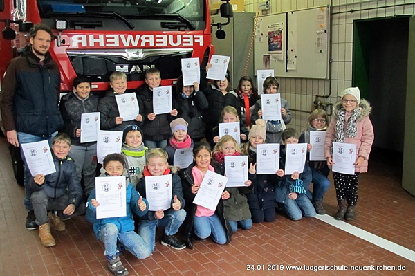 Was tun, wenn‘s brennt? Wer sich diese Frage erst stellt, wenn‘s wirklich brennt, der hat ein Problem. Die Schülerinnen und Schüler des 3. Jahrgangs haben sich daher schon jetzt mit dieser Frage beschäftigt, um im Ernstfall zu wissen, was zu tun ist. Nachdem Herr Rakers von der Freiwilligen Feuerwehr Neuenkirchen bereits vor einigen Wochen in der Ludgerischule zu Besuch war und die Schülerinnen und Schüler mit wertvollen Informationen versorgt hat, durften sich die Kinder nun einmal die Feuerwehrstelle in Neuenkirchen genauestens anschauen.