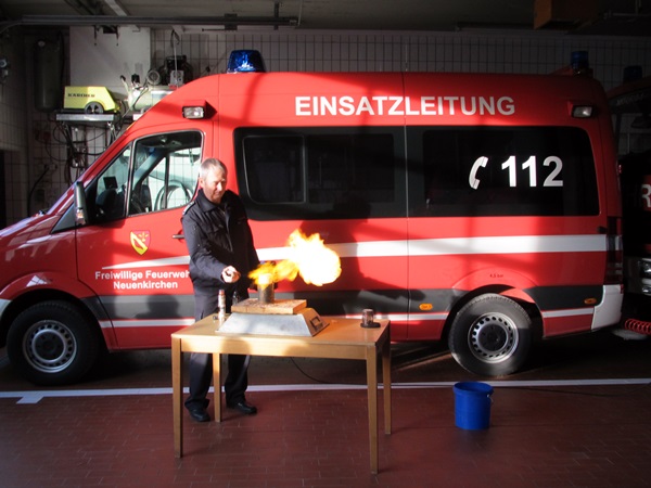 Nach dem Film wurde es noch einmal spannend, denn Herr Rakers verdeutlichte die Gefahren von Feuer durch verschiedene Experimente. Zu sehen gab es die Folgen eines Löschversuchs von brennendem Fett mit Wasser sowie brennenden Klebstoff, der brennt, ohne dass man eine Flamme sieht.