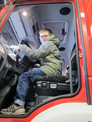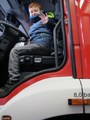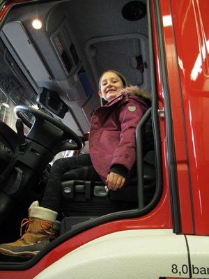 Natürlich durfte jeder einmal am Steuer der Löschfahrzeuge sitzen – der Motor blieb aber aus. Auch das klassische Foto vor einem der großen Fahrzeuge durfte nicht fehlen. Aber es blieb nicht nur bei einer „Besichtigung“.