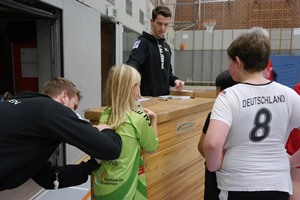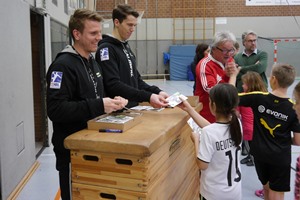 „Ich finde es super, wenn wir als Spieler des TVE in die Grundschulen gehen, um die Kinder für den Handsportsport zu begeistern. Wir Bundesligaspieler sind da schon gewisse „Zugpferde“. Wenn ich an meine eigene Handball-Vergangenheit zurückdenke, war es für mich als junger Spieler immer das Größte, mal mit den Profis trainieren zu dürfen und zugleich die größte Motivation, auch den Sprung in den Bundesliga-Handball schaffen zu wollen.“ Und Sven Weßeling ergänzt: „Die Kids sind hier und heute top-motiviert, einige haben echt Talent. Wenn wir dabei mithelfen können, dass einige Schüler durch uns den Weg in den Vereins-Handball finden: Super! Für mich ist es jedes Mal wieder schön, nach Neuenkirchen zurückzukommen. Vor 12 Jahren war ich ja selbst noch Schüler der Ludgerischule, in dieser Halle habe ich meine ersten Trainingseinheiten in der Handballabteilung des SuS Neuenkirchen absolviert.“