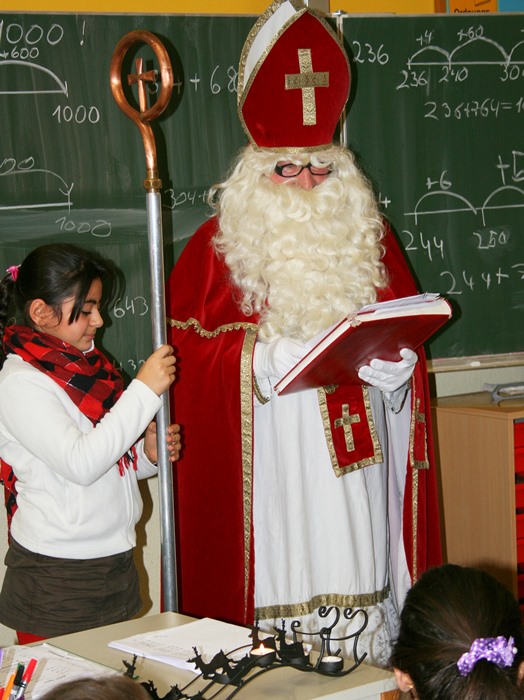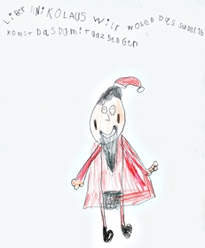 Die Klasse 1b hatte sogar eine richtige "Einladung" an den heiligen Mann geschrieben und ihn auch noch toll gemalt. "Seid mal still, ich glaube, ich habe was gehört", flüsterte die Klassenlehrerin, Frau Meyer. Jetzt hörten wir es auch. Es klopfte. Wie angewurzelt saßen wir auf unseren Plätzen, als dazu noch seine laute Glocke ertönte. "Nikolaus komm in unser Haus" sangen wir laut und kräftig und vorallem .... alle Strophen. Die Klasse 4c hatte ein besonderes Lied einstudiert - den "Hirtenrap". Diesen Song kannte der heilige Mann noch nicht, und er fand unseren coolen und fetzigen Gesang einfach klasse. "Na, wart ihr denn auch artig?", so seine erste Frage. "Natürlich, denn an unserer Schule gibt es nur brave Jungen und Mädchen. Sein Helfer, Knecht Rubrecht, hatte leider an diesem Morgen keine Zeit. Er mußte zusammen mit den Engeln auf den Schlitten aufpassen.