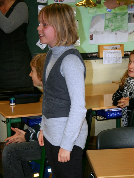 Ganz mutige Schülerinnen trugen sogar auswendig ein Gedicht vor. Ein paar Fragen mußten an dieser Stelle aber unbedingt mal geklärt werden. "Was macht der Nikolaus, wenn er Urlaub hat?" "Machst du auch Urlaub am Strand " oder "Hast du eine Frau?" Auf jede Frage wußte er eine Antwort und wir stellten fest: "Der Nikolaus ist richtig nett!". Er nahm sich viel Zeit für uns und fragte die Klassen auch nach ihren Hobbies. Gegen Mittag mußte er auch schon wieder weiter, denn an diesem Tag hatte er natürlich noch sehr viel zu erledigen.