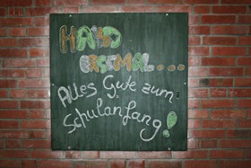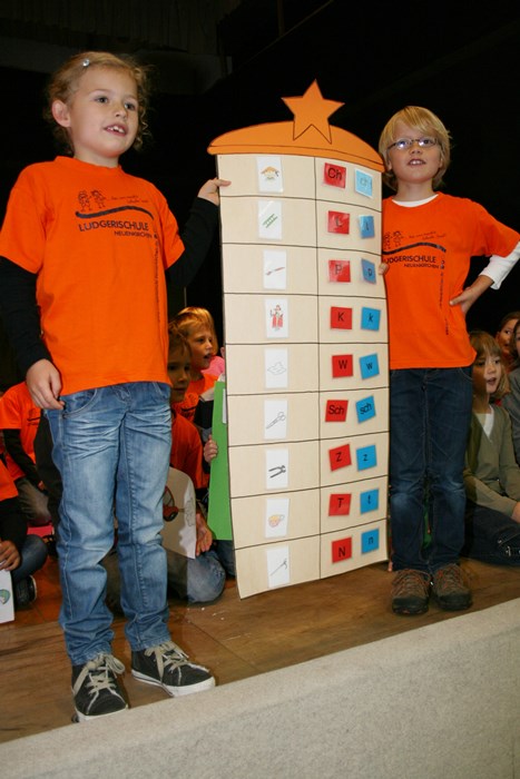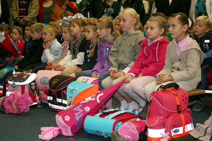 Die Jungen und Mädchen des zweiten Jahrgangs sangen für uns "Alle Kinder lernen lesen, Indiander und  Chinesen". Das Lied war uns schon aus dem Kindergarten bekannt und wir sangen sogleich mit. Auch der angehauchte Rapsong "A wie Apfel, B wie Ball" ließ  uns aufhorchen, denn das waren die neuen Buchstaben, die wir unbedingt lernen wollten. Mit unserer Klassenlehrerin gingen wir dann in die Klassen und setzen uns erst mal auf einen freien Platz. Dabei strahlten wir über das ganze Gesicht, denn so viele neue Sachen gab es hier zu sehen. Alle waren sehr nett und erste Freundschaften wurden auch schon geknüpft. Während dieser Zeit tauschten sich unsere Eltern, Schreiben und Lesen. Großeltern und Paten bei einer Tasse Kaffee und Kuchen in der Turnhalle aus. Der Förderverein hatte dieses Einschulungscafe organisiert. Ein Dank gilt den zahlreichen Kuchen- und  Brötchenspendern und den vielen Helfern. Dann ging die erste Schulstunde leider viel zu schnell zu Ende und wir mußten unser Schulsachen schon wieder zusammenpacken. Aber eine klitzekleine Hausaufgabe gab es zum Glück schon mal: "Malt die Schultüte richtig schön bunt an." Das fanden wir prima. Endlich konnten wir unsere neuen Stifte ausprobieren und Lesen, Schreiben und Rechnen lernen.