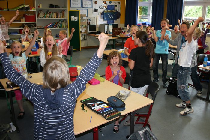 Sehr, sehr viele Schüler und Schülerinnen haben mitgemacht, denn schließlich wollten ja alle Sieger sein. Zuerst wurde der dritte Platz bekanntgegeben. Dieser ging an die Klasse 1b von Herrn Waltermann. Über den zweiten Platz freute sich die Klasse 4a von Frau Heuermann-Spittler und als strahlende Gewinner hat die Klasse 4c von Frau Kröger das Rennen gemacht. Nur welchen Preis gab es zu gewinnen? Bei diesem Wetter fiel die Entscheidung nicht schwer. Was könnte es da Schöneres geben, als ein leckeres Eis für alle Jungen und Mädchen der Klasse. Wir gratulieren den Gewinnern und wünschen euch viel Spaß.