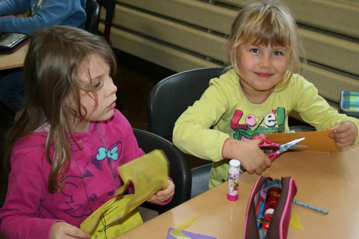 Dabei wurde nicht nur geklebt und ausgeschnitten, sondern die Jungen und Mädchen bewiesen auch handwerkliches Geschick und sägten kleine Äste zurecht.