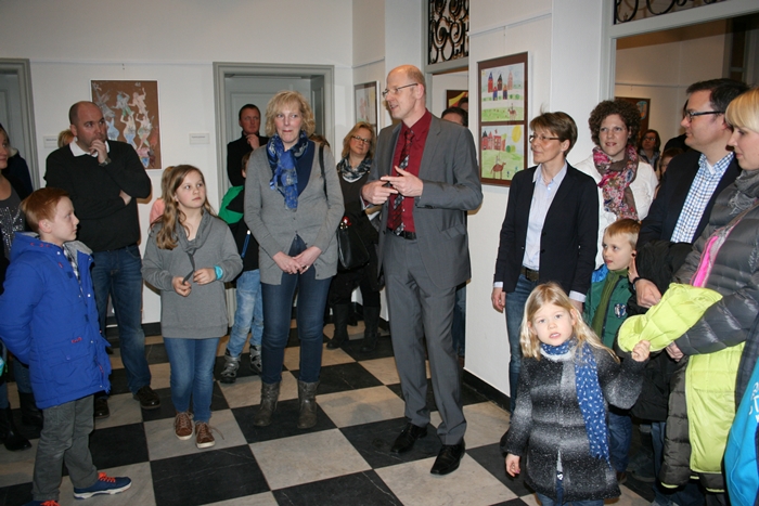 „Es gibt da diese gebräuchliche Redewendung: „Das ist ja 08/15". Diese wird verwendet, wenn etwas ganz Normal ist; also nichts Besonderes ist", mit diesen Worten begrüßte der Schulleiter des Arnold-Janssen-Gymnasiums (AJG), Meinolf Dörhoff, die zahlreichen Gäste, u. a. auch den Bürgermeister Franz Möllering am Donnerstagabend in der Villa Hecking zur Ausstellung „Hendel für Kinder". Dann fuhr er fort: „Ich möchte aber sagen: „Das was hier an Kunstwerken entstanden ist, ist auf keinen Fall 08/15! Vielleicht ist es hier 9/19 oder 10/18, wenn man mal den Altersunterschied zwischen den kleinen und großen Künstlern und Künstlerinnen betrachtet. Alle haben ganz toll zusammengearbeitet – Klein mit Groß - einfach eine hervorrangende Leistung."