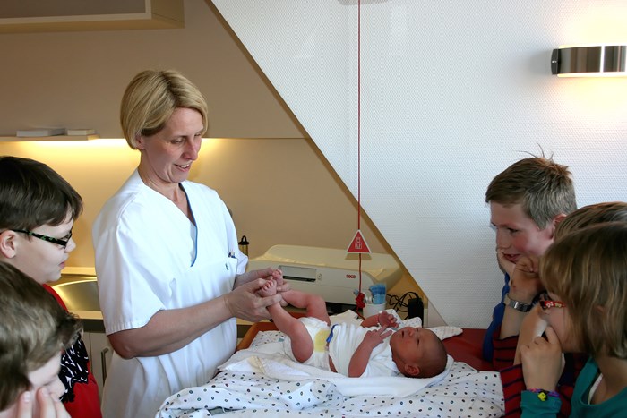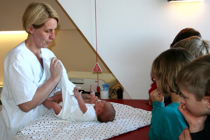 Zusammen mit der Hebamme Sylvia Adrian bewundert die zweite Gruppe das gerade erst mal zwei Tage alte Baby „Hanna". „Oh, was ist das süß", Leandra ist fasziniert von dem kleinen Wesen unter der Wärmelampe. „Kann es uns denn auch schon sehen?" fragen alle in die Runde. „Hanna sieht im Moment noch alles sehr verschwommen", erklärt die Hebamme den Kindern, „aber hell und dunkel kann sie schon unterscheiden."