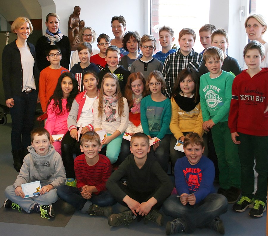 Am 12.03.2015 besuchte die Klasse 4b die Entbindungsstation des Mathias-Spitals. (v.l.hinten: Klassenlehrerin Rabea Hüppop, Silke Pomp, Assistensärztin Nina Welp, Kreissaal-Oberärztin Dr. Christiane Fröhlich; re. hinten: Hebamme Sylvia Adrian)
