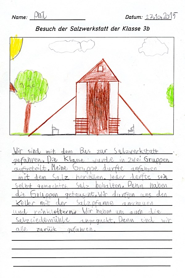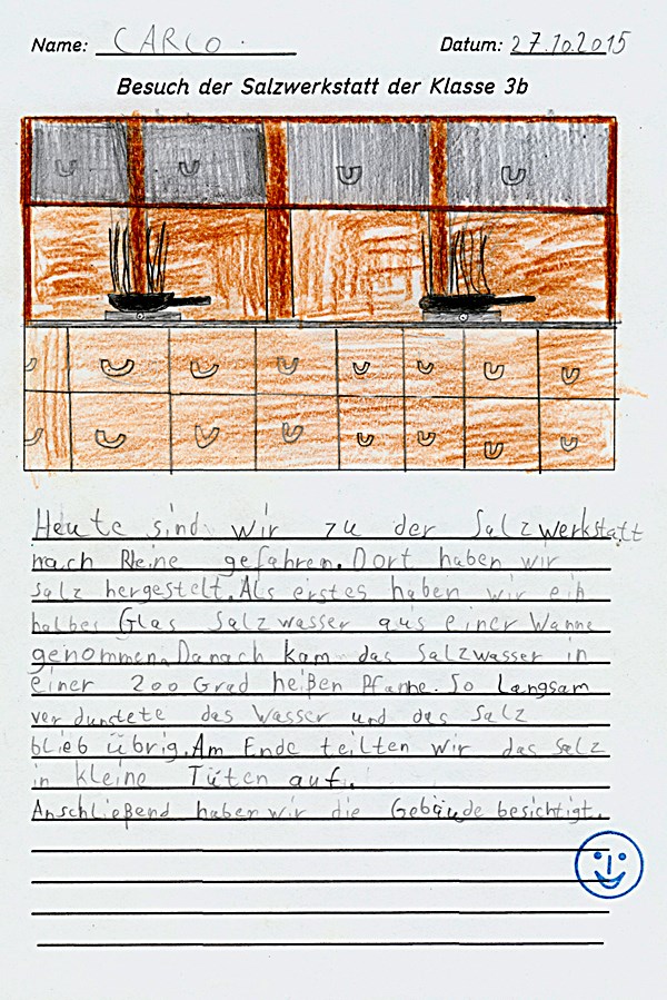 Vor ein paar Wochen unternahm auch die Klasse 3b einen Ausflug zur Salzwerkstatt nach Rheine. Aufgeteilt in zwei Gruppen erfuhren sie viele interessante Dinge über die Herstellung, Gewinnung und Weiterverarbeitung von Salz. In der Fotogalerie findet ihr ein paar Bilder und einige Schüler haben uns ihren Tagesbericht zur Verfügung gestellt. Klickt doch mal auf den Button "weiterlesen" und erfahrt mehr von diesem schönen Erlebnis.