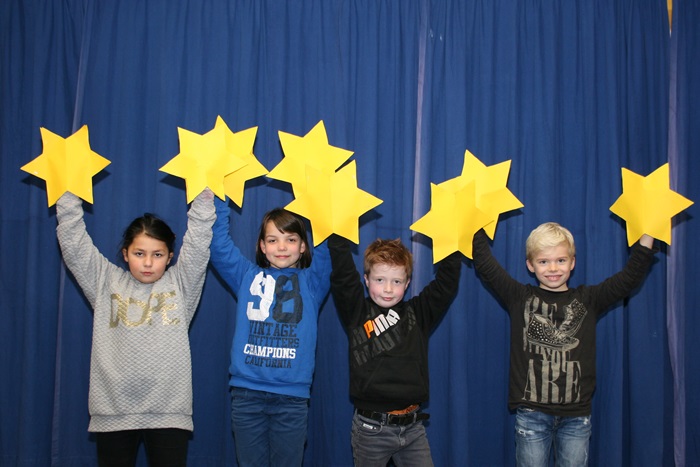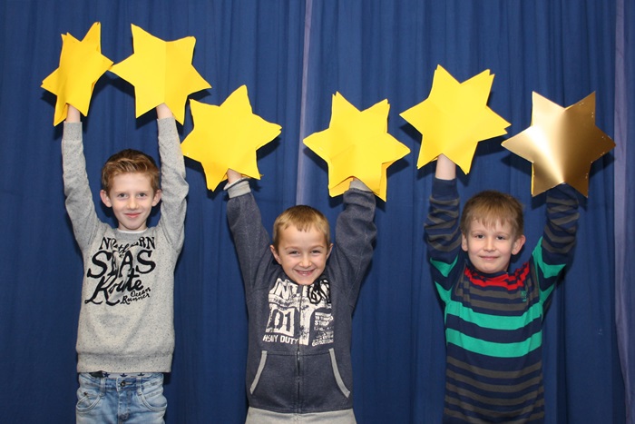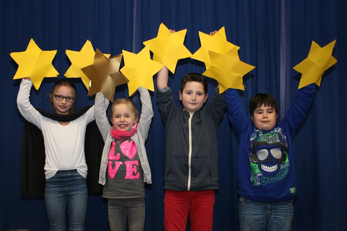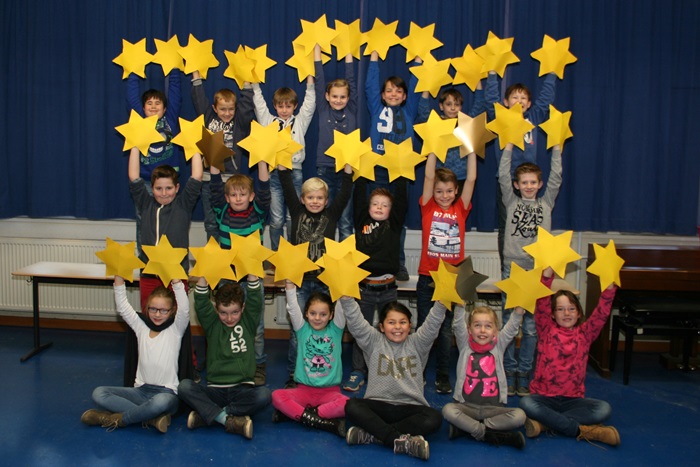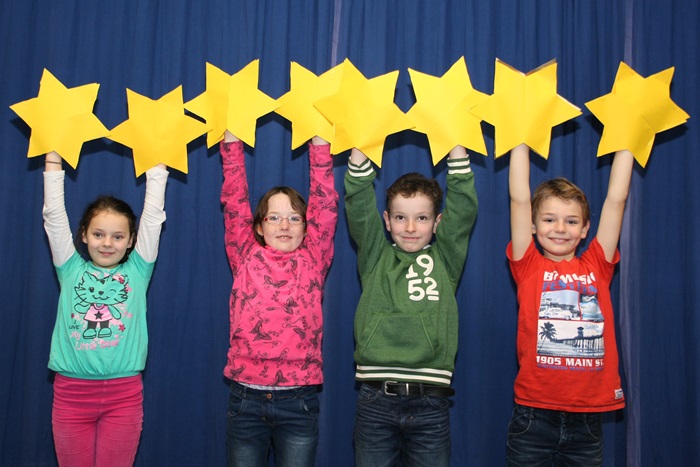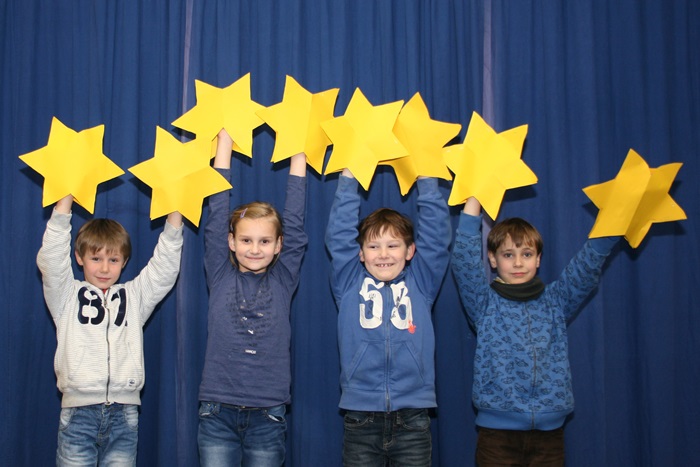 Mit großer Freude präsentierten die Jungen und Mädchen der Klasse 3a ihre gebastelten Sterne. Für ein Gruppenfoto versammelten sich alle Kinder im Musikraum und vor dem blauen Hintergrund erhellten die Sterne das Zimmer. Doch damit noch nicht genug. Zudem übten auch alle fleißig für den Sternentanz zu dem Lied "Children". Diesen Tanz führten sie dann vor laufender Kamera auf der Bühne in der Turnhalle auf.