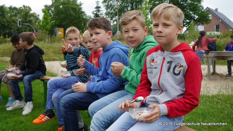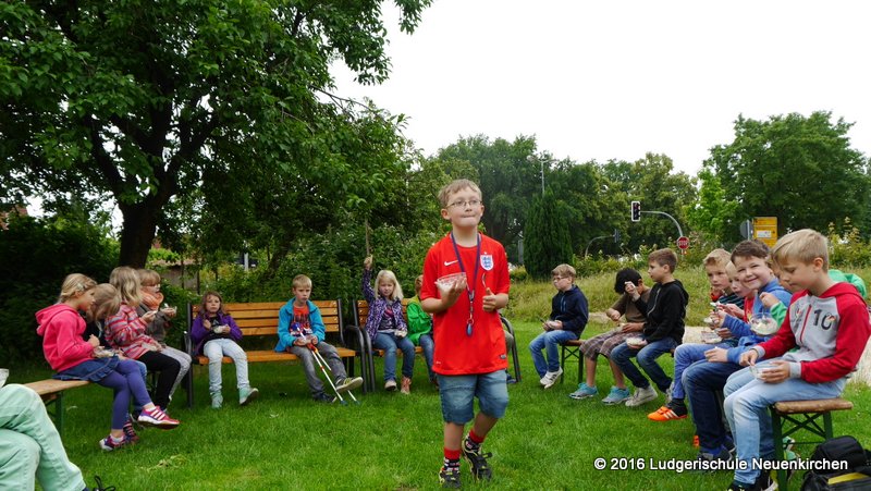 Diese Belohnung haben sich die Kinder der Klasse 2c redlich verdient! Wer gemeinsam im Verlauf des Schuljahres 2.303 Bücher und Geschichten liest, dazu auf www.antolin.de unzählige Verständnisfragen beantwortet und damit `sage und schreibe´ 27.381 Punkte sammelt, der darf sich auch mal während der Schulzeit eine dicke Portion Eis gönnen. So geschehen am vergangenen Montag in der 2. Unterrichtsstunde, als sich die Kinder gemeinsam mit ihren Lesepaten Frau Krukkert, Herr Carstensen, Frau Richter, Frau Weinrich und Frau Willers die kalten Köstlichkeiten schmecken ließen.