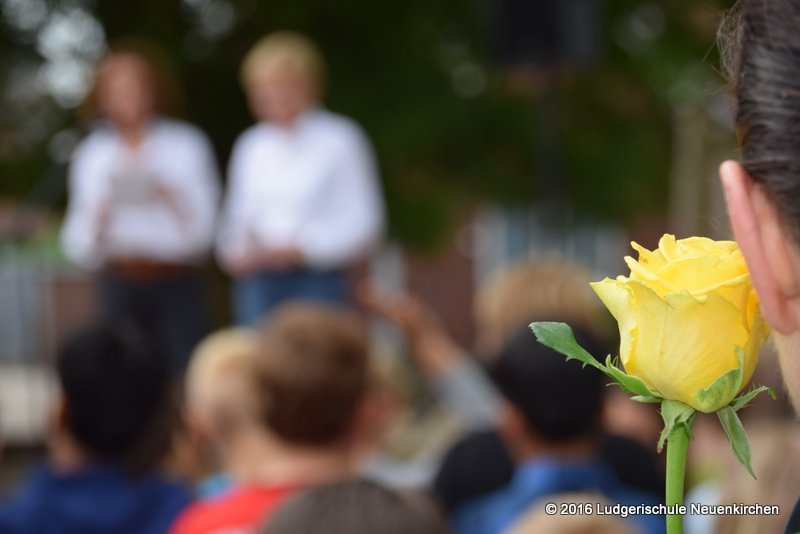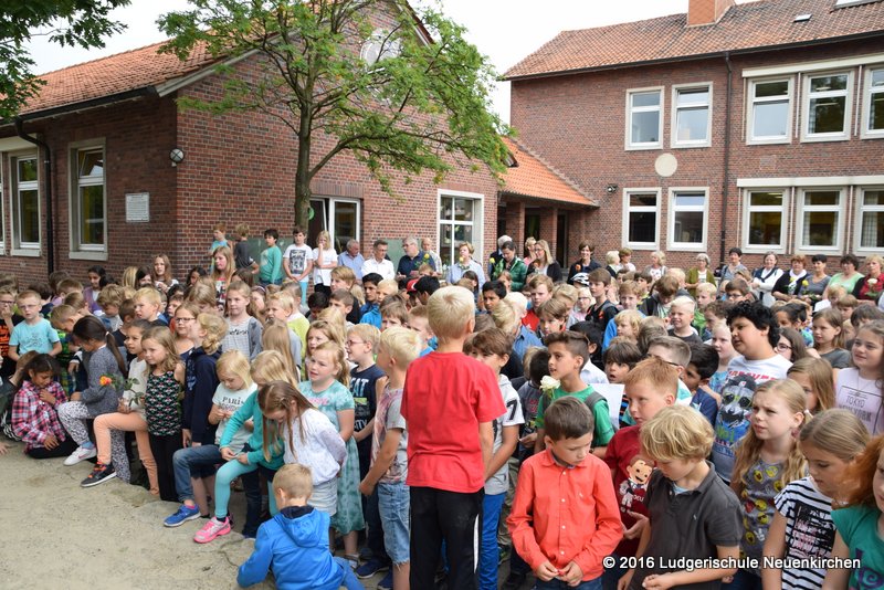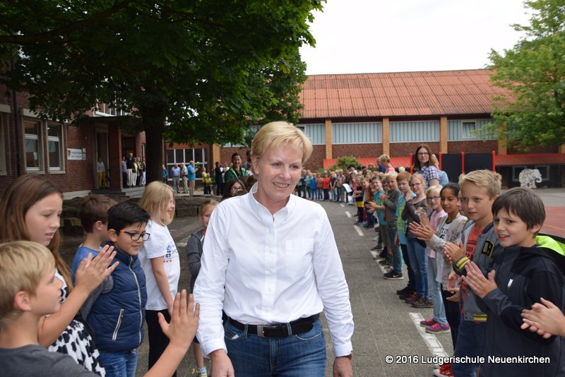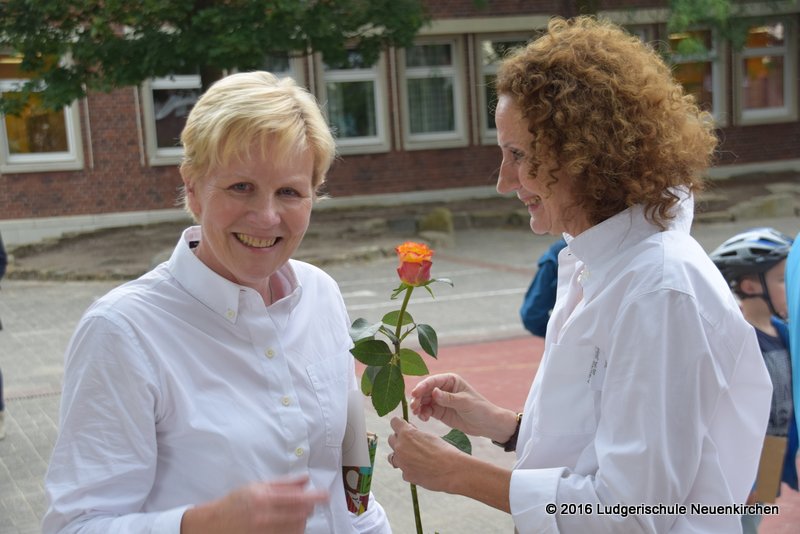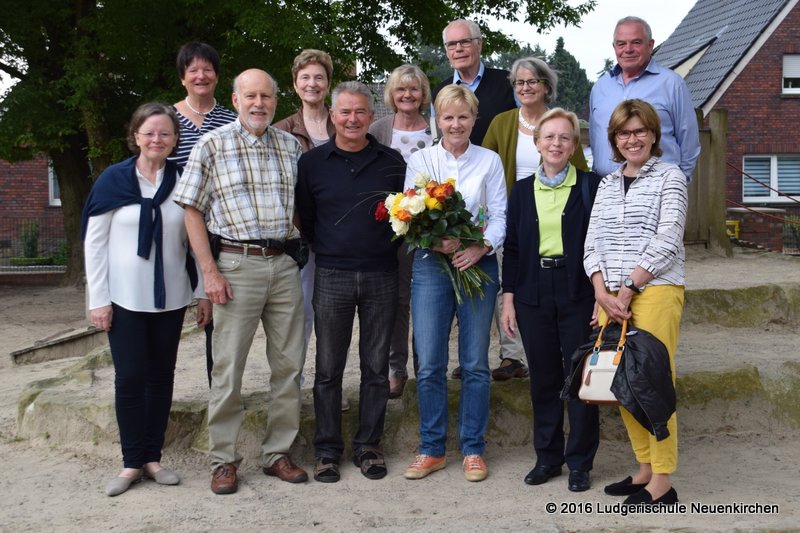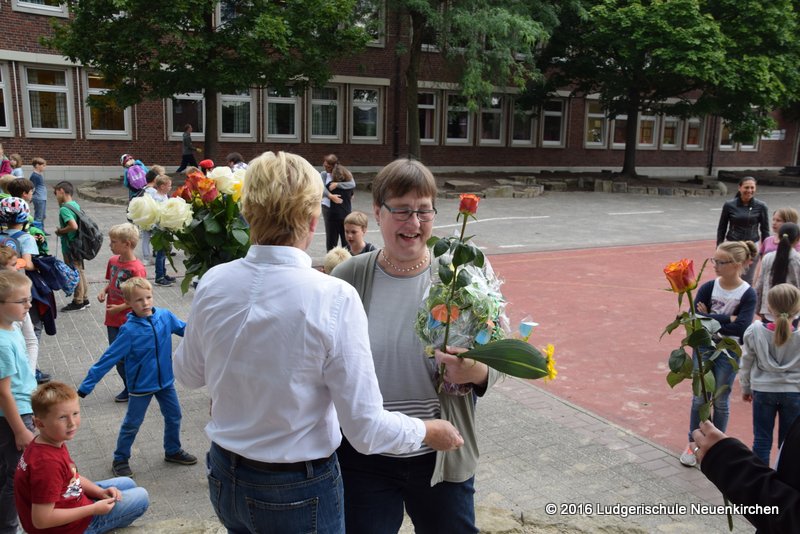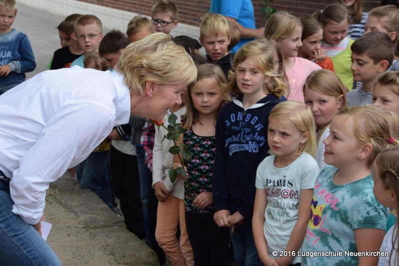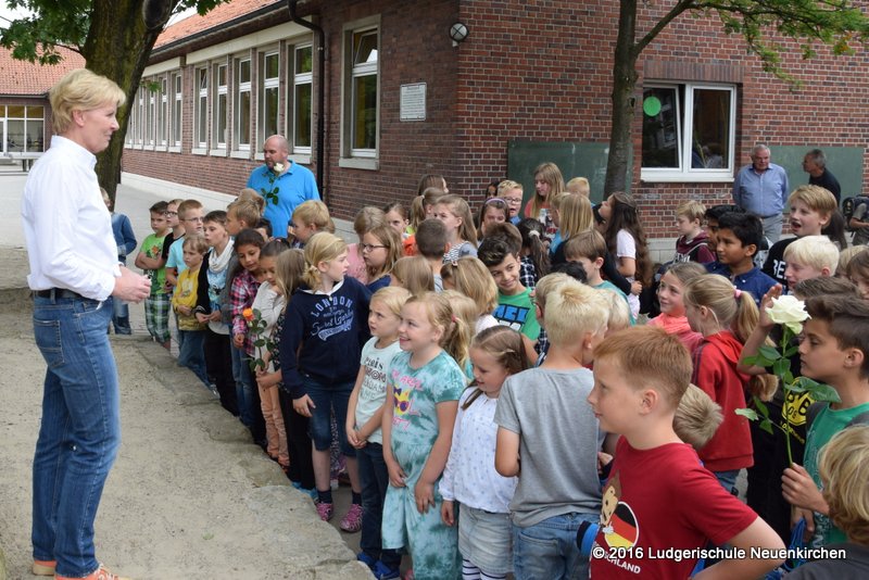 „Eine Schulsekretärin ist eine Chefsekretärin mit sozialpädagogischer Kompetenz.“ Irene Schwarz, langjährige Schulsekretärin an der Ludgerigrundschule in Neuenkirchen, verabschiedete sich am Freitag vor den Ferien in den Ruhestand. Alle Schülerinnen und Schüler, das Kollegium, viele Ehemalige und Freunde der Schule empfingen die beliebte Sekretärin mit Rosen und dem Ludgeri-Song auf dem Schulhof.
