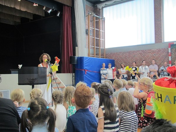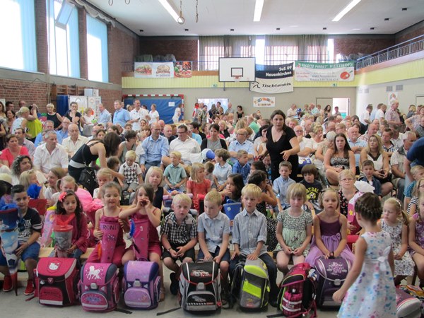 In der Turnhalle wurden die „I-Männchen“ und natürlich auch die „I-Fräuleins“ der Ludgerischule zunächst von ihren neuen Mitschülern begrüßt. Das übernahmen wie in jedem Jahr vertretungsweise die Zweitklässler. Danach hatte die Schulleiterin Frau Fenk-Stein das Wort und Pippi Langstrumpf aus ihrer Schultüte erscheinen. Pippi packte ihre Schultasche aus und erklärte den Kindern, was für die Schule wichtig ist.