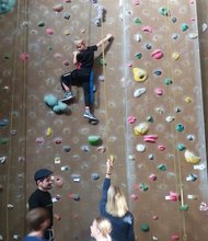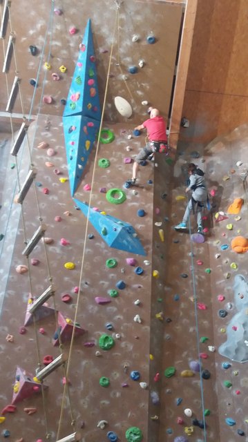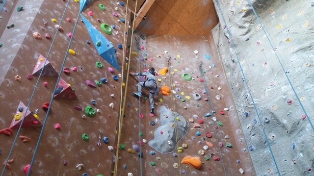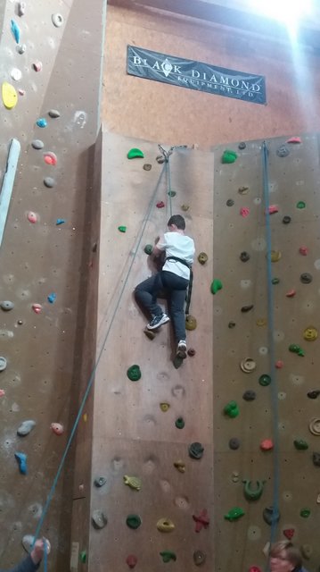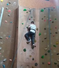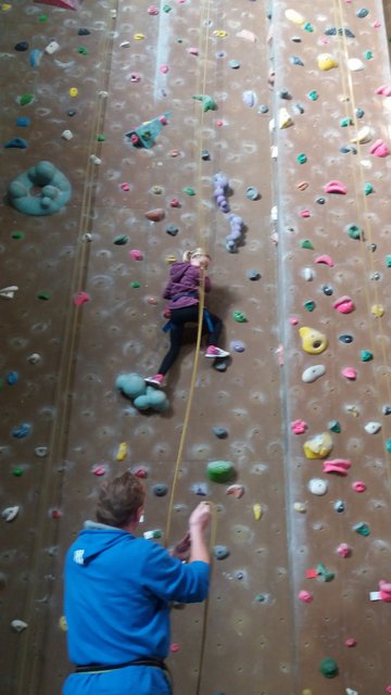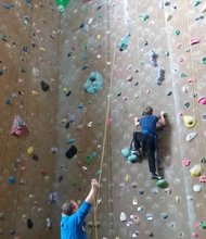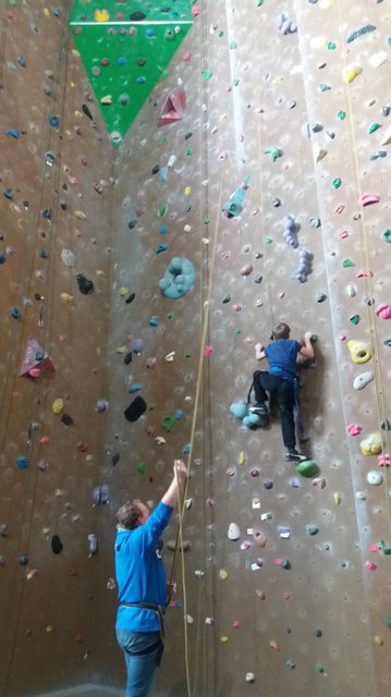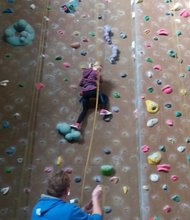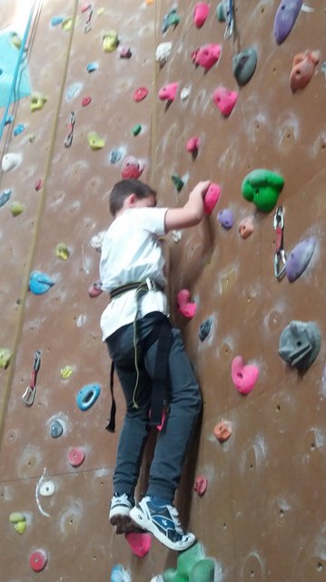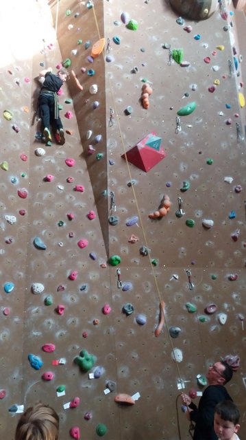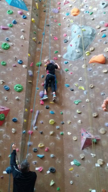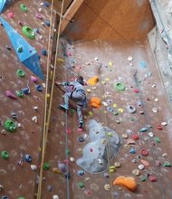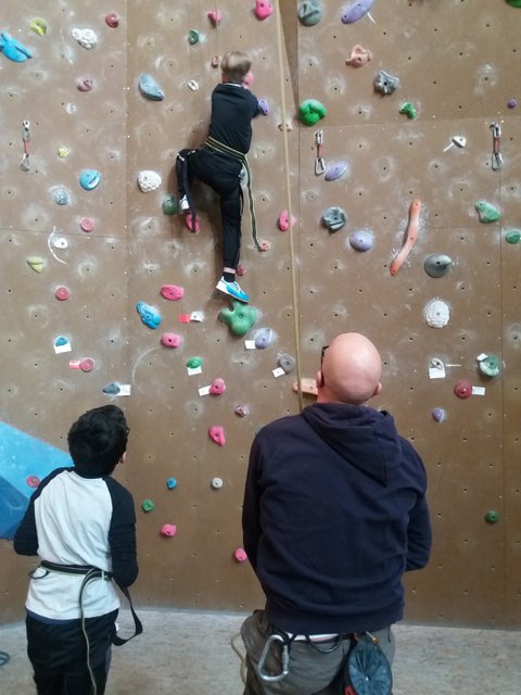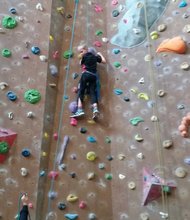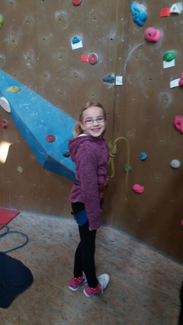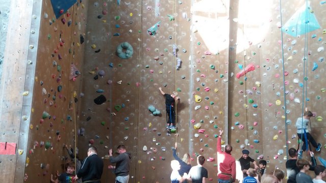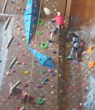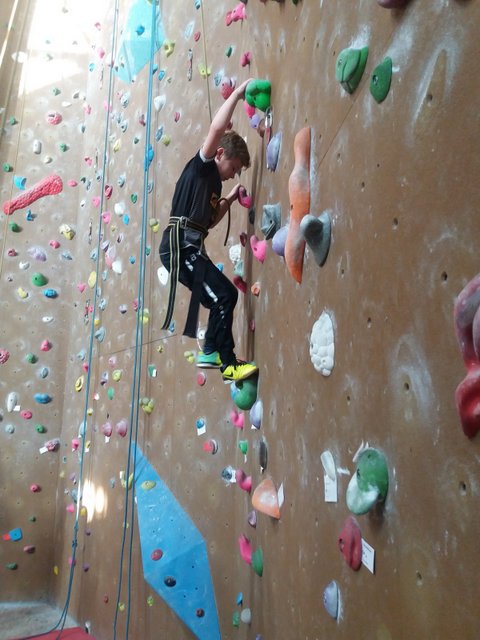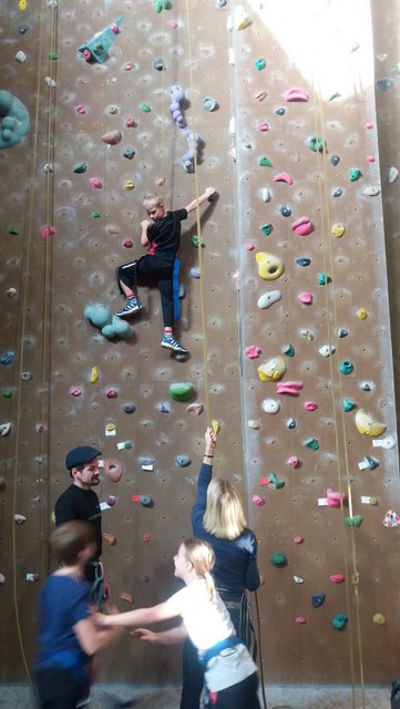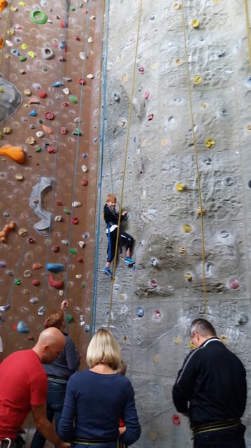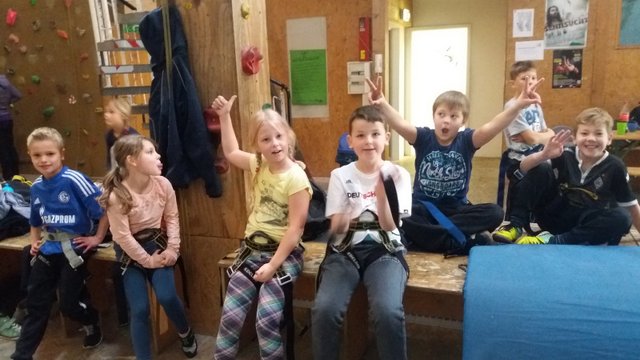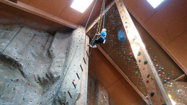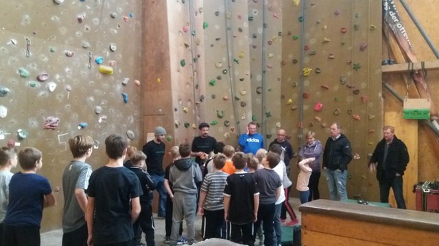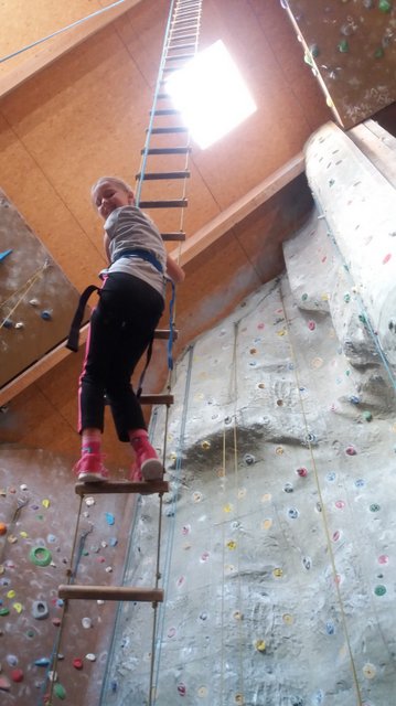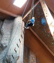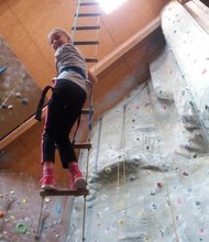 Dann hieß es 'Auffi´ - und der Elan der Kinder kannte keine Grenzen. Bis zu 15 m hohe Wände wurden erklommen, verschiedene Schwierigkeitsgrade mussten gemeistert werden. Und auch die Strickleiter bis unter das Dach der Halle wurde erfolgreich bestiegen.