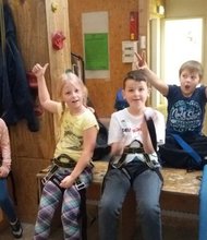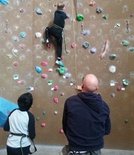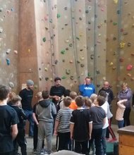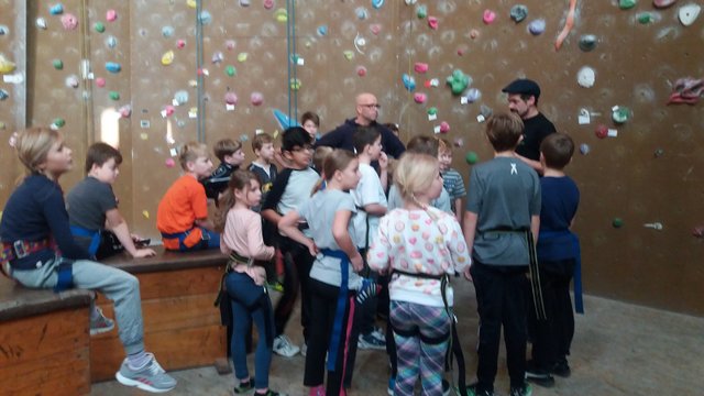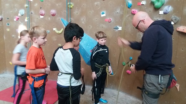 “Sicherheit zuerst“ hieß es dabei zu Beginn der Trainingseinheit. Unter fachkundiger Anleitung der BIG WALL-Teamer Markus und Yannick wurden die mitfahrenden Eltern mit den Sicherheitstechniken des Kletterns – doppelter Achterknoten und Sichern mit dem HMS-Karabiner - vertraut gemacht, um anschließend die Drittklässler sowie einige Geschwisterkinder per Seil an der Wand zu sichern.