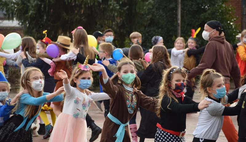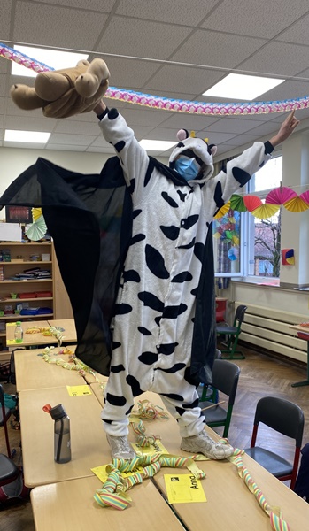 Die angesagten Karnevalshits durften natürlich nicht fehlen und führten zu Begeisterungsstürmen aller Lehrer und Schüler. DJ Hausmeister Wilfried Hüwe stand nach der großen Pause am Mischpult und mit einer Polonaise und lauter Musik zogen die kleinen Karnevalisten quer durch die gesamte Schule.