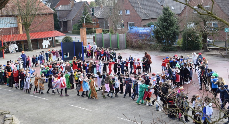 Ludgerischule Helau!!! Am Freitagmorgen kochte die Stimmung im Schulgebäude förmlich über. Endlich wieder ausgelassen feiern und mit den Freunden und Lehrkräften auf den Tischen tanzen. Die Jungen und Mädchen zählten die Tage bis Karneval und konnten es kaum abwarten. Schon früh morgens sorgten die als Schafe, Prinzessinnen, Marienkäfer, Clowns, Feen und Polizisten verkleideten Kinder für ein buntes Bild rund um das Schulgelände.