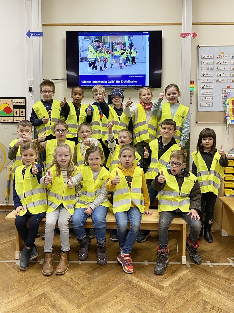 Die Klasse 1b hat zusammen mit ihrer Klassenlehrerin Anne Kothe beim Gewinnspiel des ADAC Verkehrssicherheitskreis NRW e.V. "Sicher leuchten in Gelb" mitgemacht und Sicherheitswesten für die ganze Klasse gewonnen.