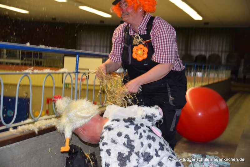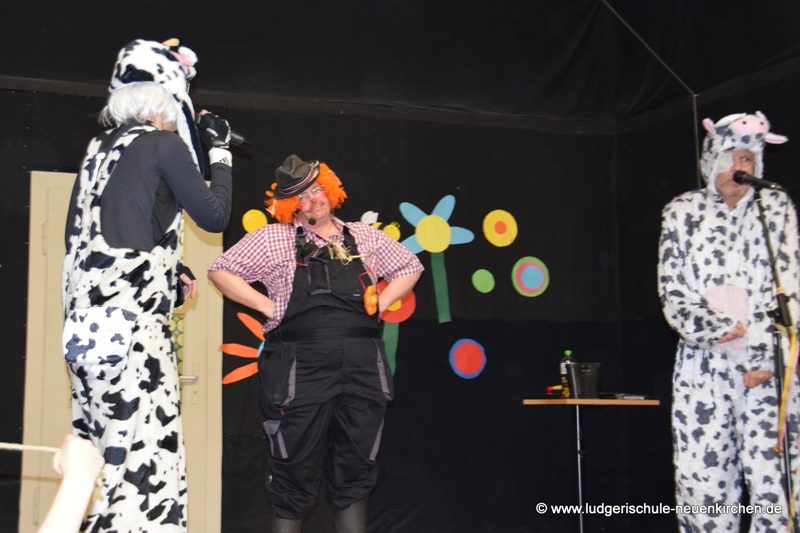 Wie immer gut gelaunt und voller Tatendrang begrüßte die Schulsekretärin Heike Zasche als Kuh Mathilda die aufgeregte Schülerschar. Unterstützung bekam sie von dem Lehrer Max Sander und der Lehrerin Angelika Bungert. Mit kleinen Anekdoten und Szenen führten sie durch das Partyprogramm.